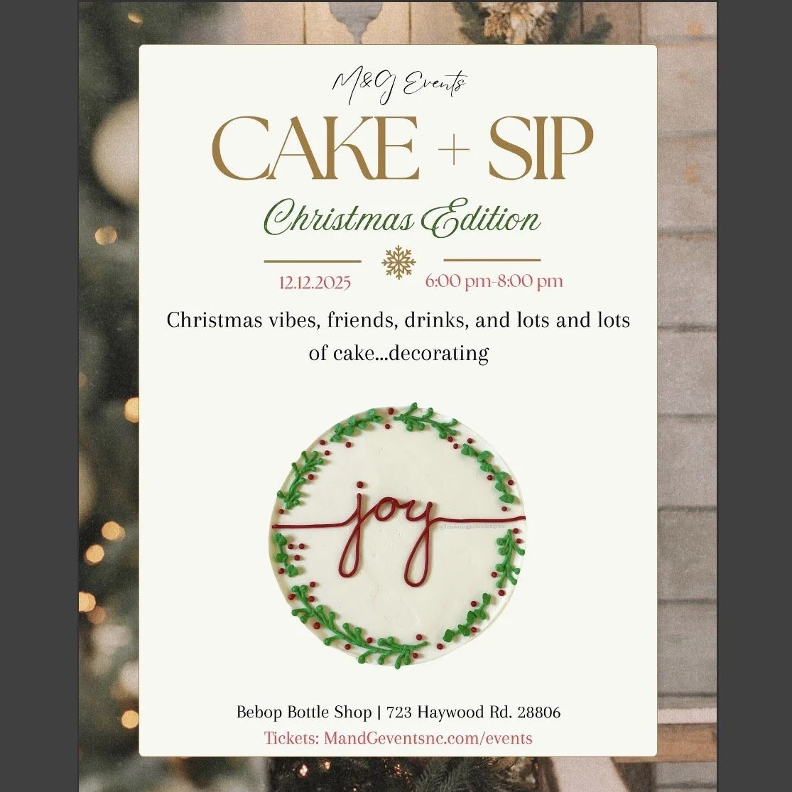 Celebrate the season with a 21+ Cake + Sip Night at Bebop Bottle Shop in West Asheville! Your $85 ticket includes a 6-inch cake to decorate, tools, light bites, and a take-home box. Enjoy holiday music, great company, and step-by-step guidance from cake artists Mel and Gena. A fun, festive night to relax, mingle, and create your own holiday cake!